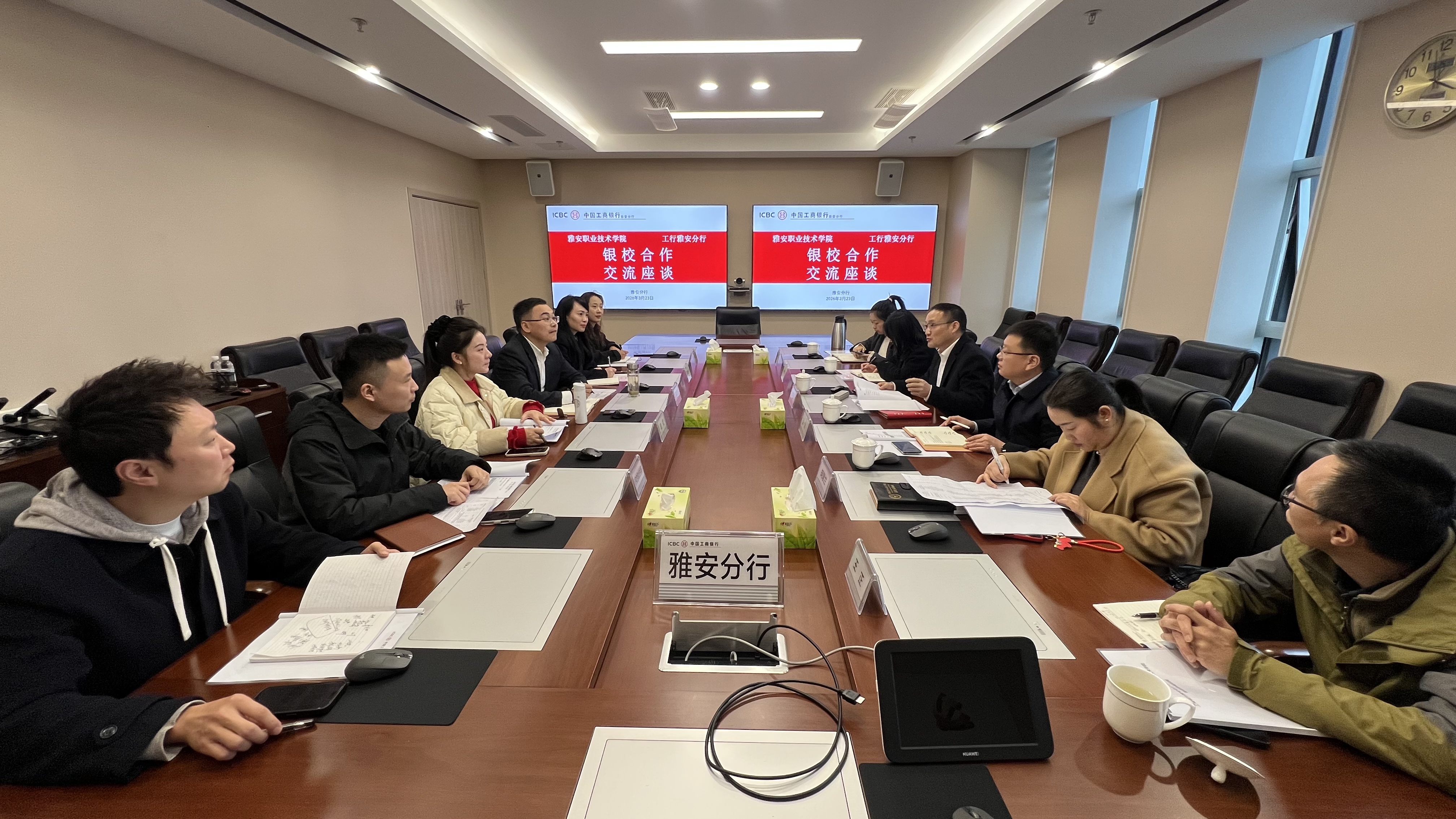 为进一步深化银校合作,推动学校高质量发展,3月23日,雅安职业技术学院与工商银行雅安分行2026年合作交流洽谈会在学校经开区校区综合楼4楼1号会议室召开。工商银行雅安分行行长常艺螣,学校党委委员、副校长樊先茂,工行雅安分行副行长周虹出席会议。学校党政办、基建后勤处、计划财务处及工行雅安分行相关部门负责同志参加会议。
