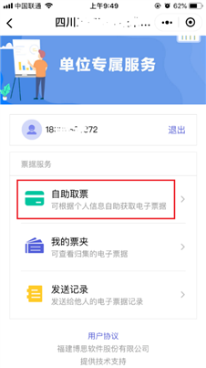 当开票成功后,可以根据登录的手机号码自动归集票据(登录的手机号码必须开电子票时提交的手机号码相同,否则无法自动归集电子票据),也可以根据学号/身份证号进【自助取票】界面进行}取票。